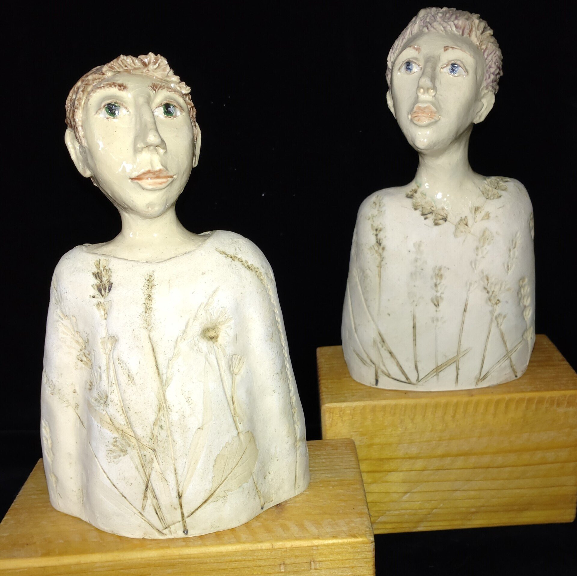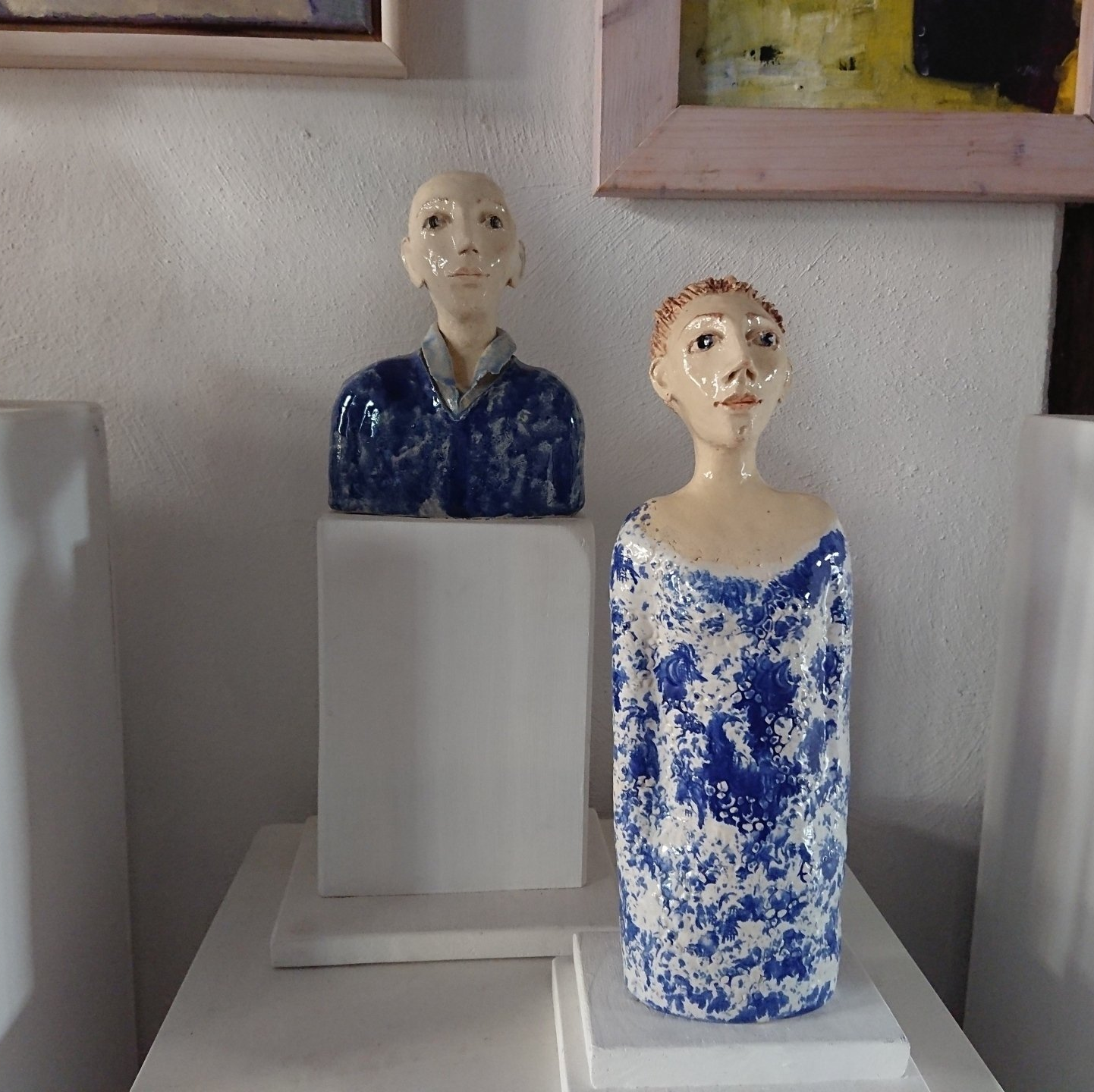 Ihre Keramikfiguren sind meist hohl aufgebaut und dünnwandig. Um Werkspuren zu erhalten werden die Arbeiten nur sehr sparsam glasiert.